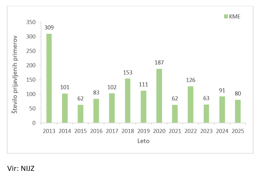 »Slovenija spada med države z največjo pojavnostjo KME in lymske borelioze. V zadnjem desetletju je za KME v Sloveniji zbolelo povprečno okrog 100 oseb letno, za lymsko boreliozo pa v povprečju okoli 4.500 oseb letno,« je na novinarski konferenci povedala dr. Marta Grgič Vitek, epidemiologinja in nacionalna koordinatorica programa cepljenja z Nacionalnega inštituta za javno zdravje (NIJZ). Pogostost KME je največja na Gorenjskem, Koroškem in v ljubljanski regiji, pogostost lymske borelioze pa na Goriškem in Gorenjskem.